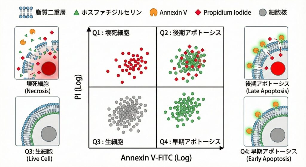 Annexin V (FITC) と PI を二次元プロット上で組み合わせて評価することで、