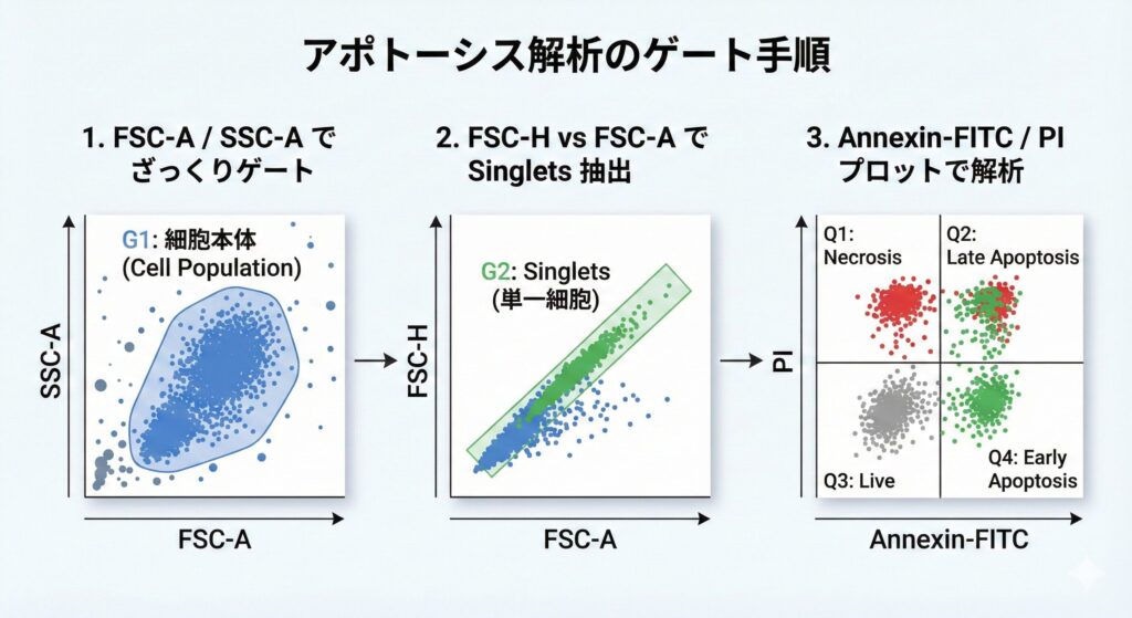 - FSC/SSC → Singlets → Annexin/PI の順にゲートを切り、デブリやダブルレットを除外する