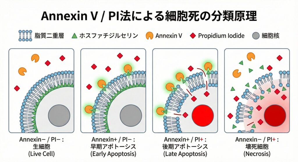 Annexin V と PI(Propidium Iodide)の原理については、メーカーや各種解説サイトで詳しく説明されています。ここでは、ざっくりとしたイメージだけ整理し、詳しいところは公式ページにお任せします。