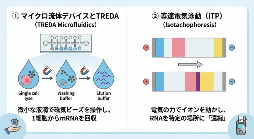 TREDA (Total RNA Extraction Droplet Array) は、微小な液滴(ドロップレット)の中で磁気ビーズを動かし、ごく微量の細胞からmRNAを回収します [12]。