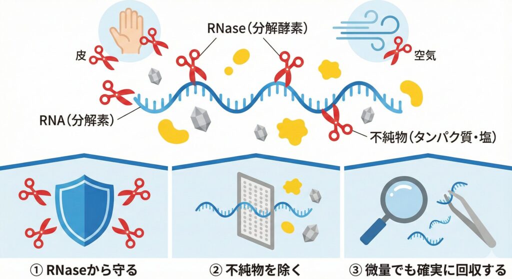 RNAは一本鎖構造であり、非常に不安定です。そして私たちの周り(皮膚、空気中、実験台)には、RNAを分解する酵素「RNase(リボヌクレアーゼ)」がうようよしています [1]。
