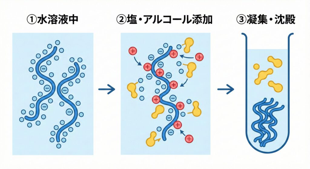 水に溶けているRNAに、塩(陽イオン)とアルコールを加えることで、RNAの周りの水分子(水和層)を剥がし、電気的に中和して凝集(沈殿)させます [2, 3]。