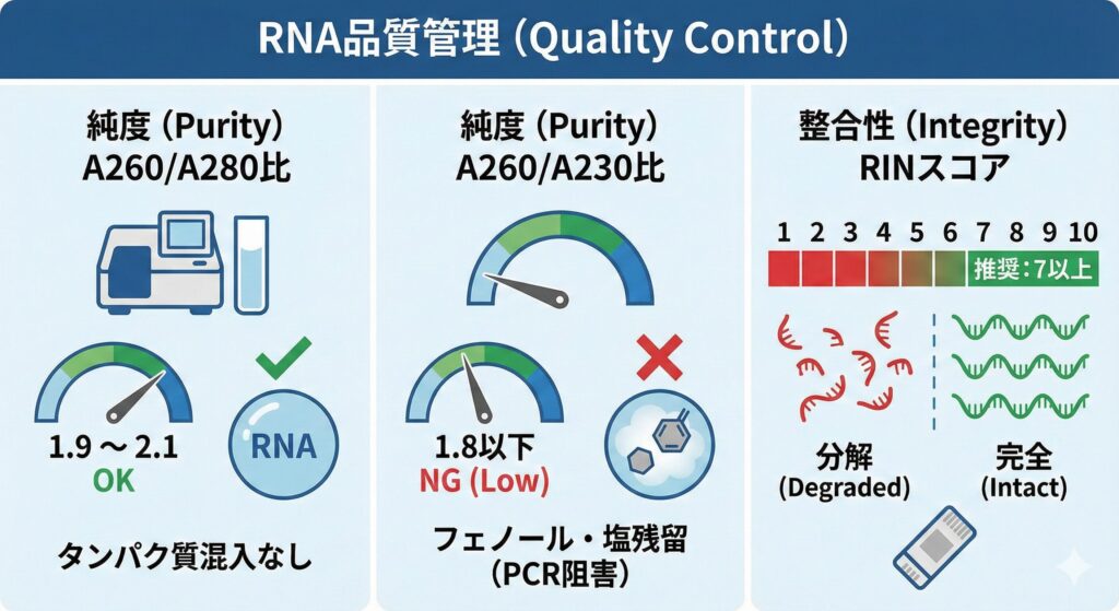 - RIN (RNA Integrity Number): RNAが分解していないかのスコア(1〜10)。NGS解析ならRIN 7以上を目指すのが望ましいと言われています [16]。
